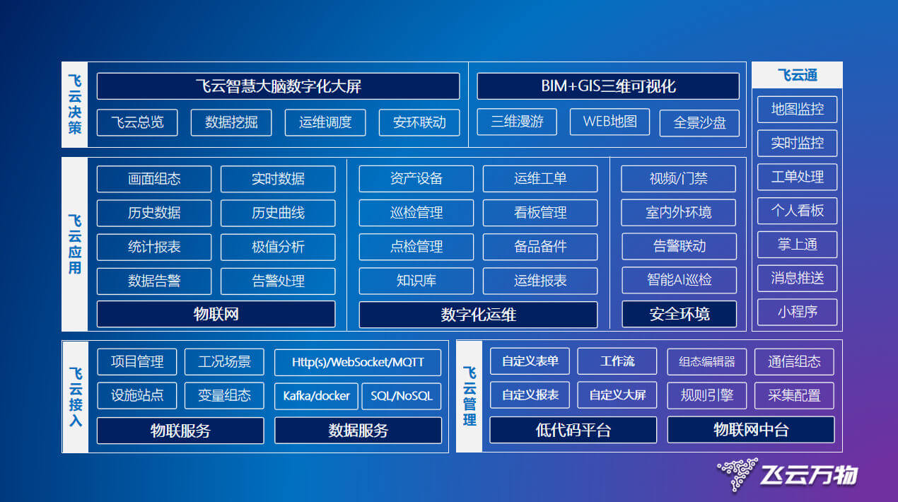 精心打造“飞云万物(AiotEasy.com)”SAAS云服务平台,采用自主研发的人工智能AI+物联网技术“飞云引擎”物联网中台,依托云平台分布式微服务架构,核心技术从传统互联网软件平台,向物联网整体技术架构扩展,形成了“云-管-边-端”融合解决方案,帮助各行业用户秉承“感-传-知-用”的核心理念